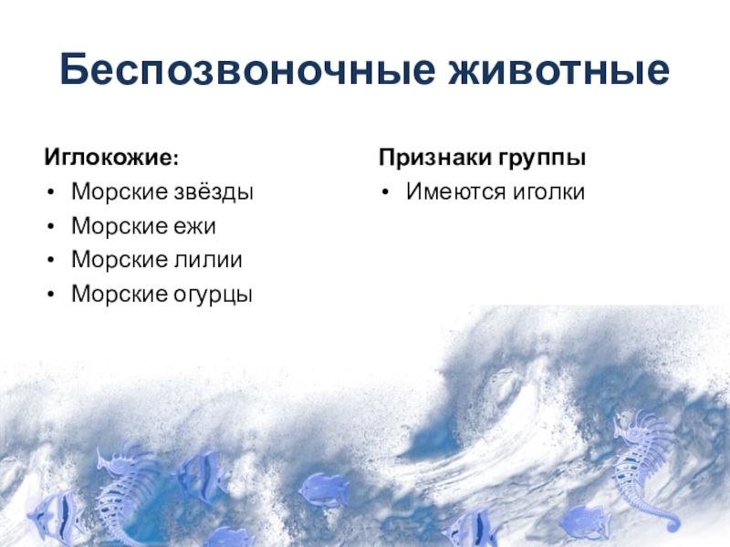 Беспозвоночные животныеИглокожие:Морские звёздыМорские ежиМорские лилииМорские огурцыПризнаки группыИмеются иголки