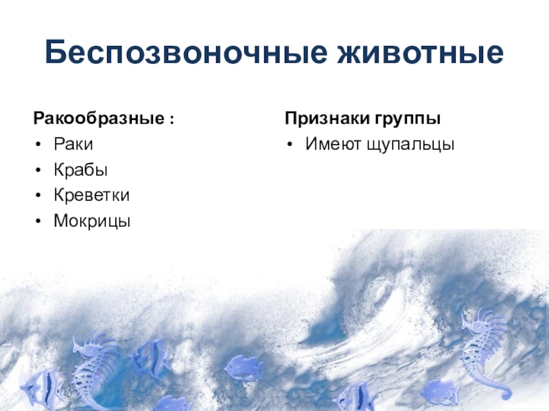 Беспозвоночные животныеРакообразные :РакиКрабыКреветкиМокрицы Признаки группыИмеют щупальцы