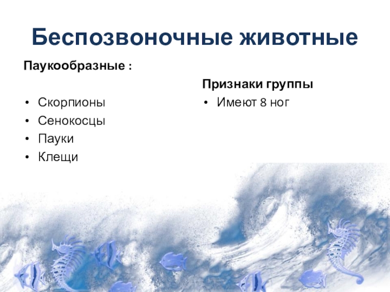 Беспозвоночные животныеПаукообразные :СкорпионыСенокосцыПаукиКлещиПризнаки группыИмеют 8 ног