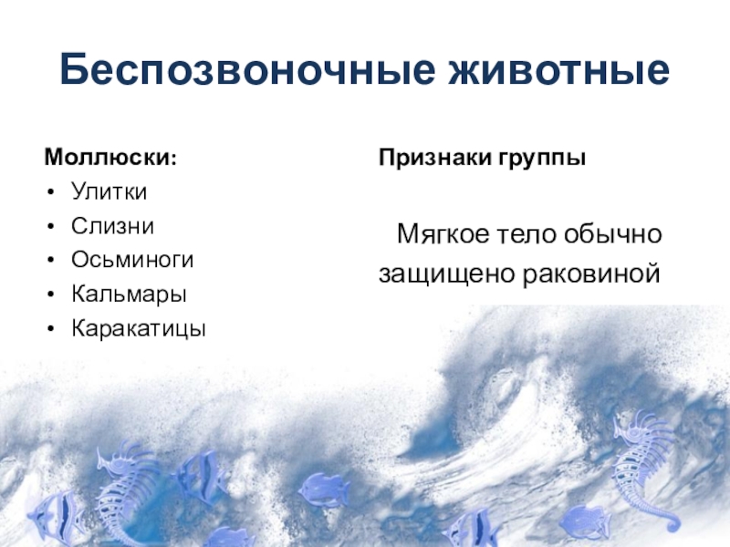Беспозвоночные животныеМоллюски: УлиткиСлизниОсьминогиКальмарыКаракатицы Признаки группы    Мягкое тело обычнозащищено раковиной