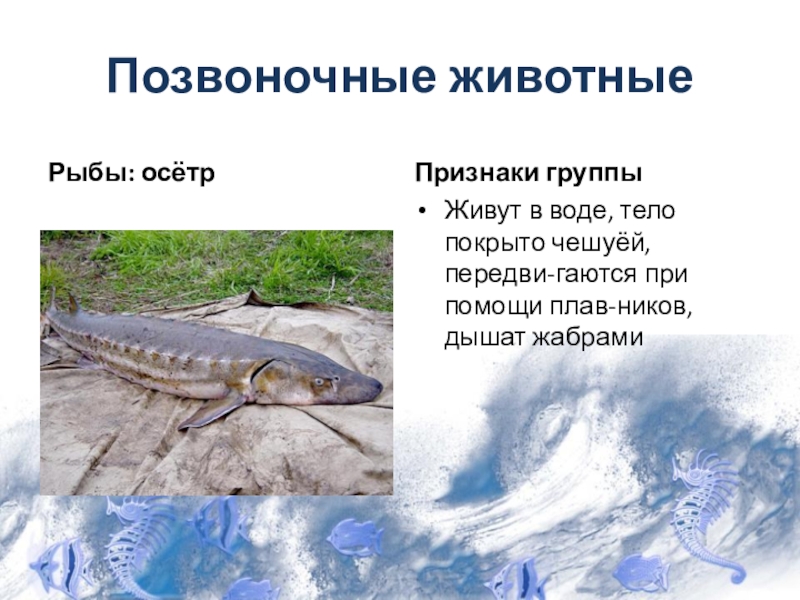 Позвоночные животныеРыбы: осётрПризнаки группыЖивут в воде, тело покрыто чешуёй, передви-гаются при помощи плав-ников, дышат жабрами