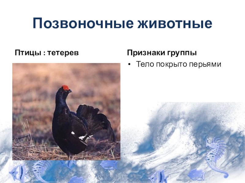 Позвоночные животныеПтицы : тетерев Признаки группыТело покрыто перьями