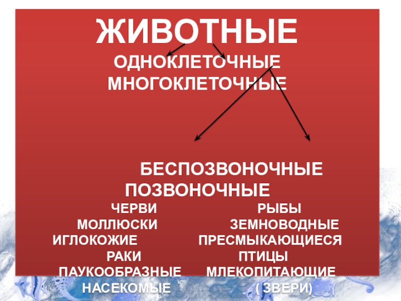 животныеОдноклеточные       многоклеточные         Беспозвоночные