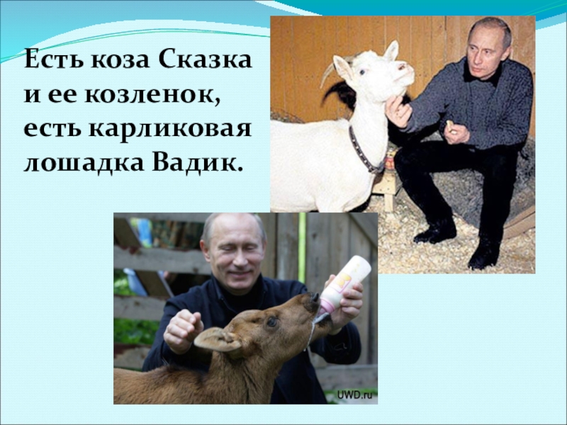 Слайд 11Есть коза Сказка и ее козленок, есть карликовая лошадка Вадик.