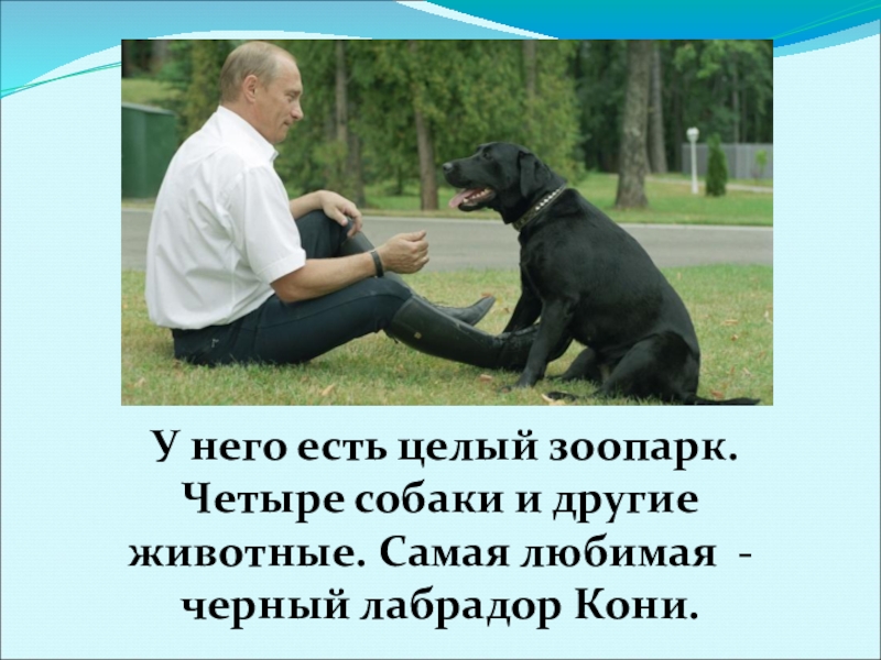Слайд 10 У него есть целый зоопарк. Четыре собаки и другие животные.