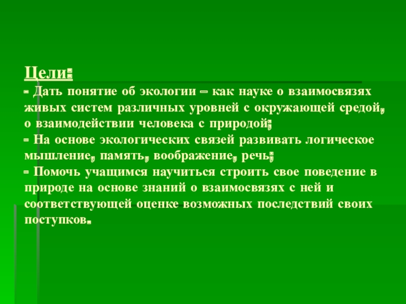 Слайд 3Цели: - Дать понятие об экологии – как науке о взаимосвязях живых