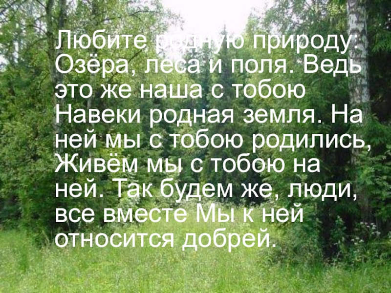 Любите родную природу: Озёра, леса и поля. Ведь это же наша с тобою Навеки родная земля. На ней мы с тобою родились, Живём мы с тобою на ней. Так будем же, люди, все вместе Мы к