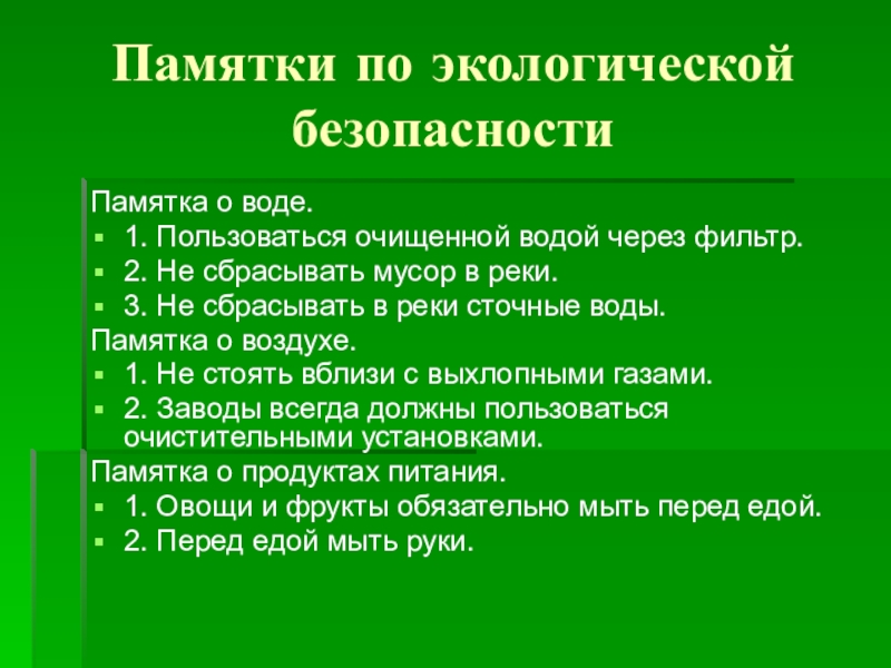 Памятки по экологической безопасности Памятка о воде.1. Пользоваться очищенной водой через фильтр.2. Не сбрасывать мусор в реки.3.