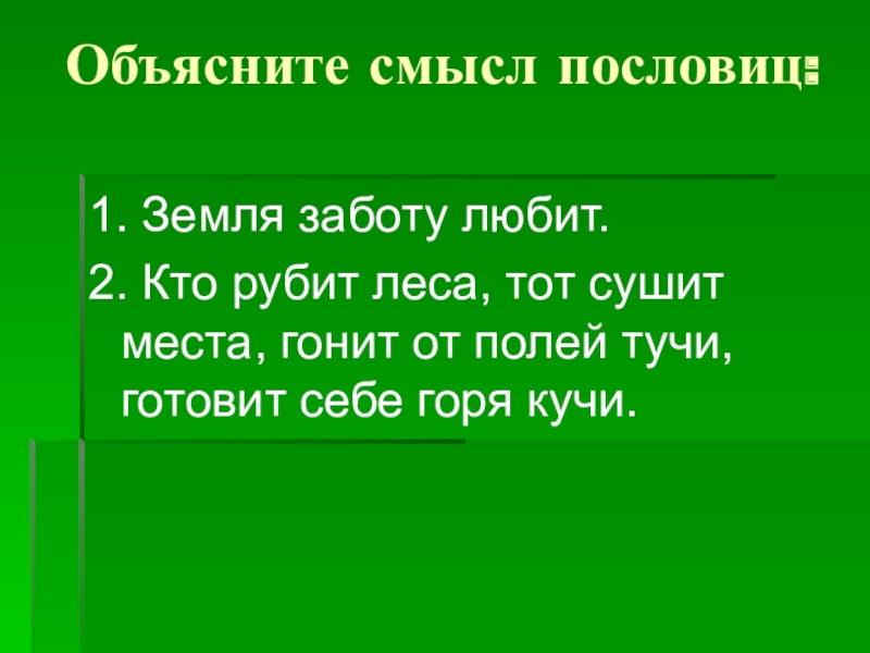 Объясните смысл пословиц: 1. Земля заботу любит.2. Кто рубит леса, тот сушит места, гонит от полей тучи,