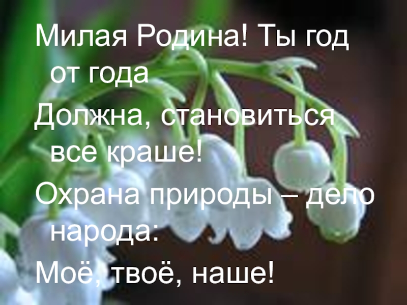 Милая Родина! Ты год от годаДолжна, становиться все краше!Охрана природы – дело народа:Моё, твоё, наше!