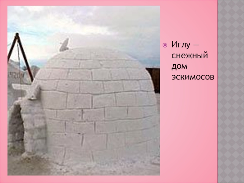 Представляет собой куполообразную постройку из уплотненных ветром снежных блоков диаметром 3—4