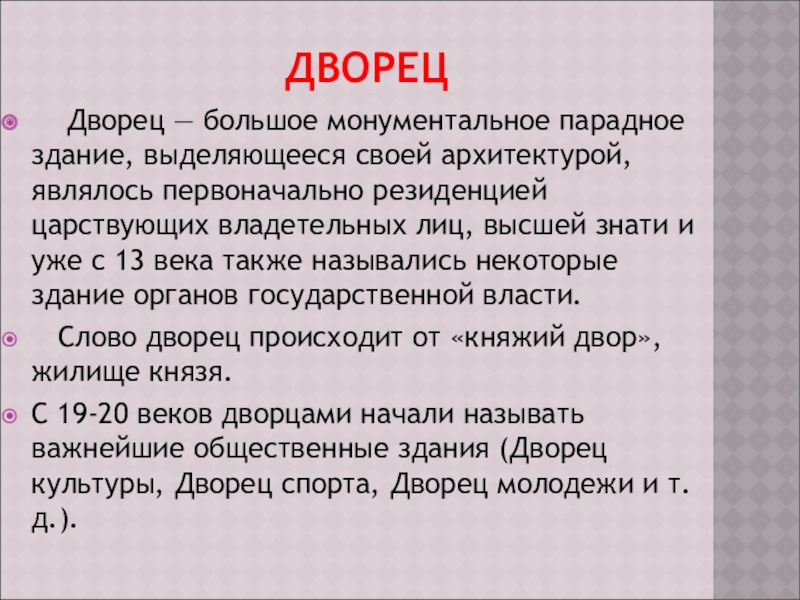 Дворец — большое монументальное парадное здание, выделяющееся своей архитектурой, являлось первоначально резиденцией царствующих владетельных лиц, высшей знати и уже с 13 века также назывались некоторые здание органов государственной власти.