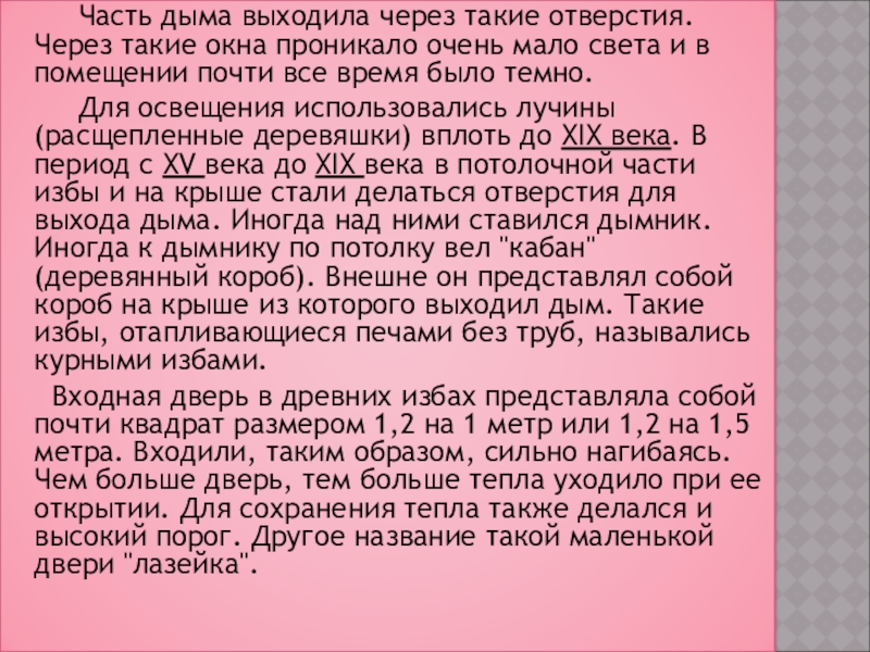 Отапливалась такая изба печью без трубы. Печь не имела выходного отверстия для дыма и дым выходил из передней её части, заполнял избу и выходил через дверь. Таким образом, частично помещение обогревалось дымом, вследствие чего вся изба зарастала копотью, которую надо было периодически смахивать метлой. В период с XIII века по XV века стали появляться отверстия в стене, так называемые волоковые окна, представляю- щие собой вырубленные щели под потолком размером примерно 30 на 40 см.