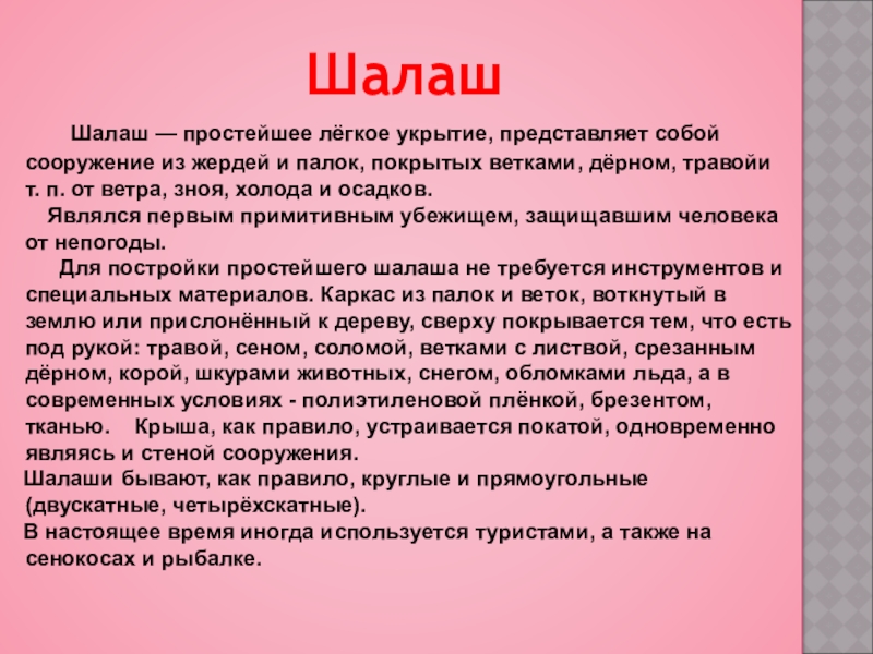 Являлся первым примитивным убежищем, защищавшим человека от непогоды.