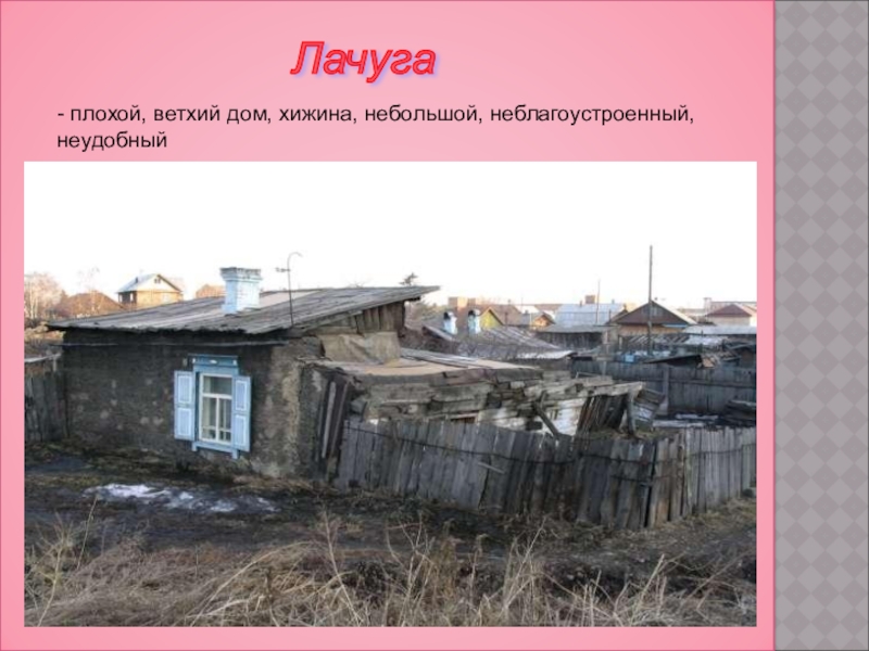 - плохой, ветхий дом, хижина, небольшой, неблагоустроенный, неудобный