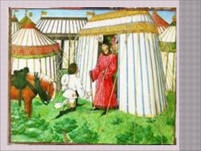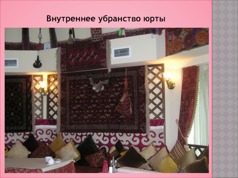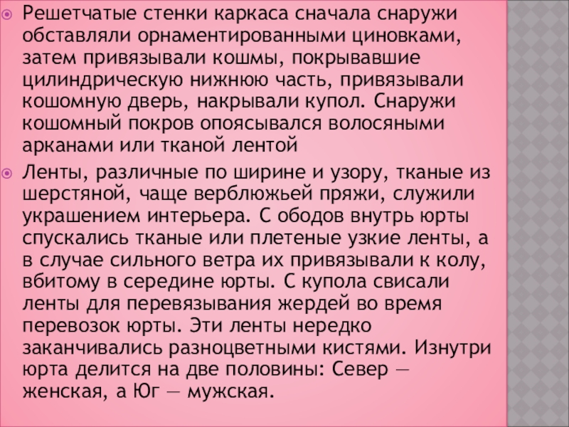 Решетчатые стенки каркаса сначала снаружи обставляли орнаментированными циновками, затем привязывали кошмы,