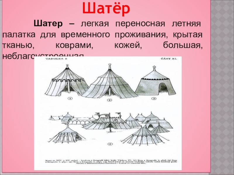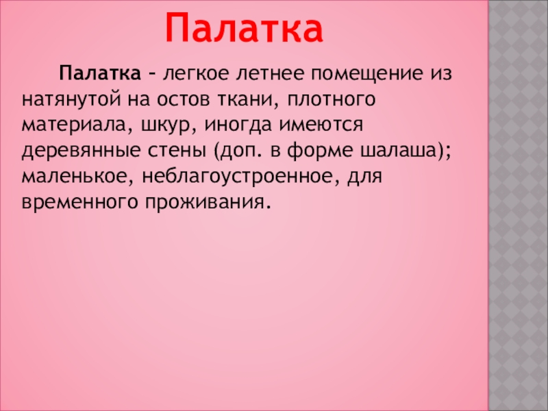 натянутой на остов ткани, плотного материала, шкур, иногда имеются деревянные стены (доп. в форме шалаша); маленькое, неблагоустроенное, для временного проживания.