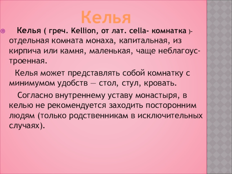 Келья ( греч. Kellion, от лат. cella- комнатка )-