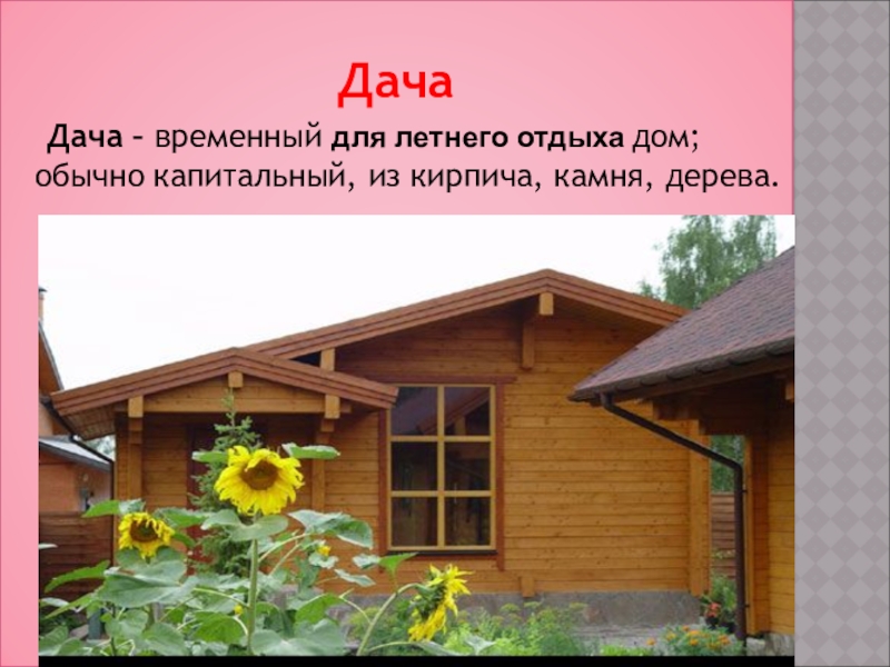 Дача – временный для летнего отдыха дом; обычно капитальный,