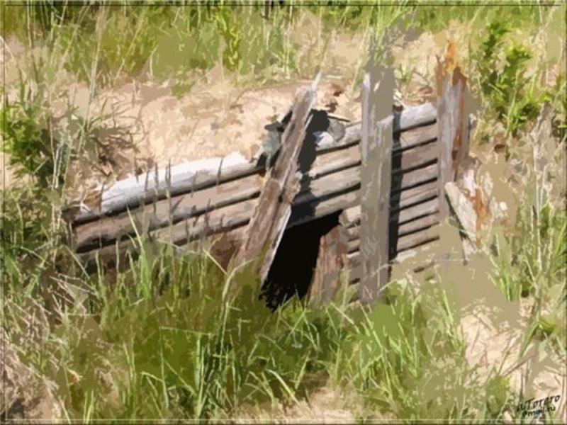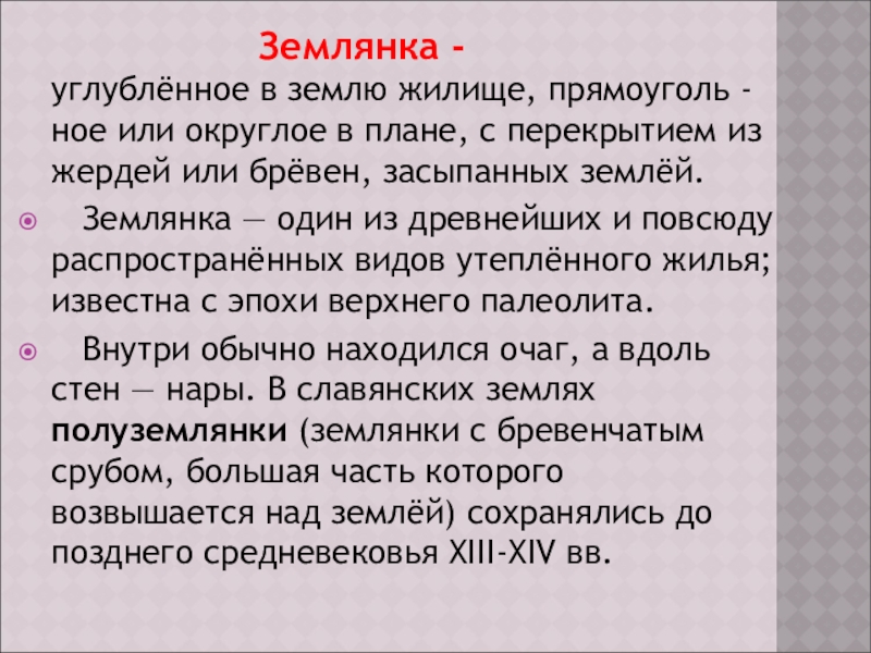 - углублённое в землю жилище, прямоуголь -ное или округлое в плане, с перекрытием из жердей или брёвен, засыпанных землёй.