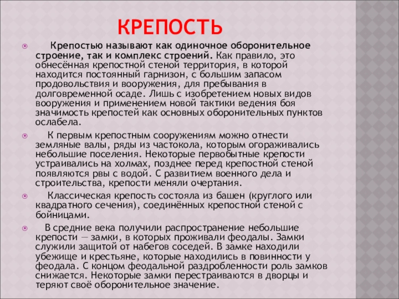 Крепостью называют как одиночное оборонительное строение, так и комплекс строений. Как правило, это обнесённая крепостной стеной территория, в которой находится постоянный гарнизон, с большим запасом продовольствия и вооружения, для пребывания в долговременной осаде. Лишь с изобретением новых видов вооружения и применением новой тактики ведения боя значимость крепостей как основных оборонительных пунктов ослабела.