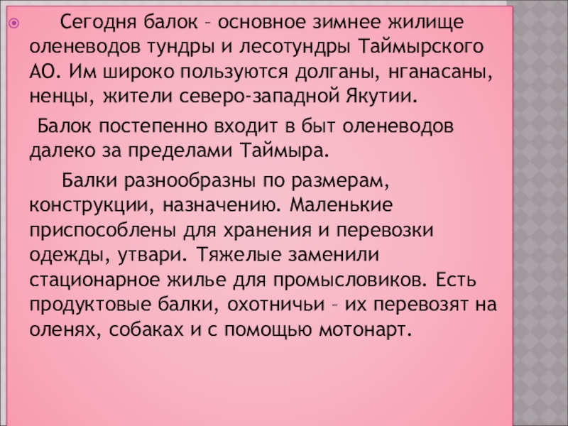Маленький балок, поставленный на сани, очевидно, пришел на Таймыр в ХVII в. Поначалу он предназначался для воевод, царских чиновников, купцов . Внутри него мог находиться в лежачем положении один чел. В начале XIX в. коренное население Таймыра приспособило балок к условиям своей жизни. Увеличились его размеры, изменилась конструкция крепления к нартам.