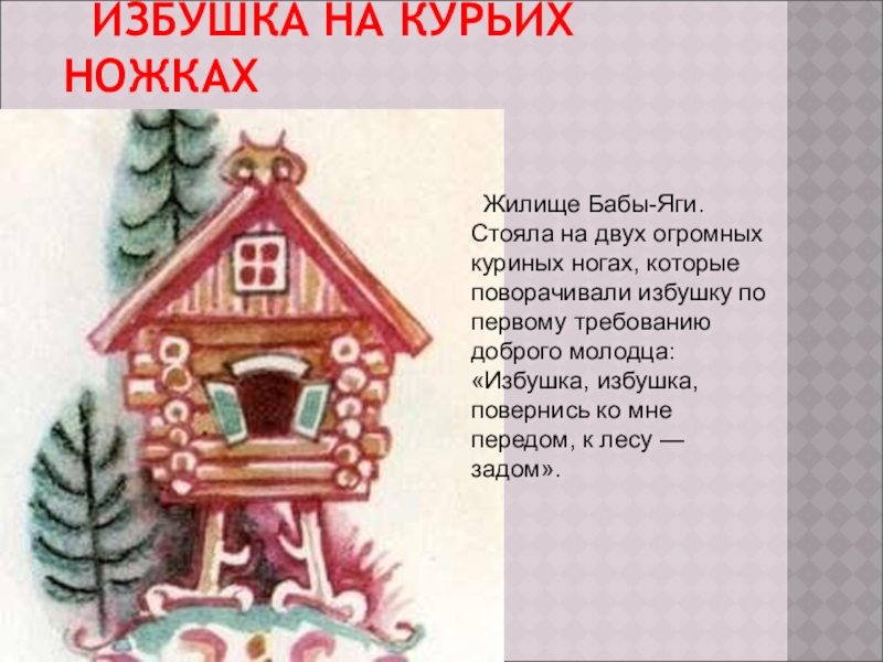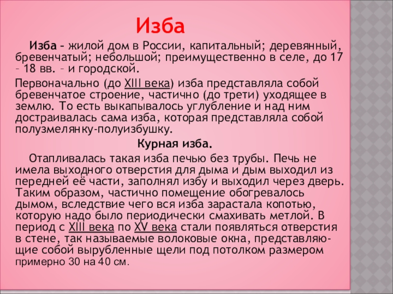 Изба – жилой дом в России, капитальный; деревянный, бревенчатый; небольшой; преимущественно в селе, до 17 – 18 вв. – и городской.