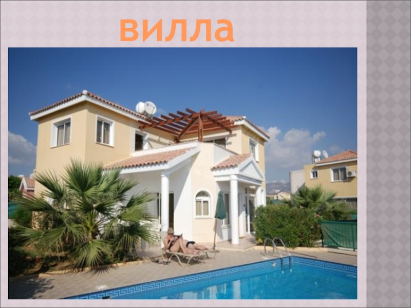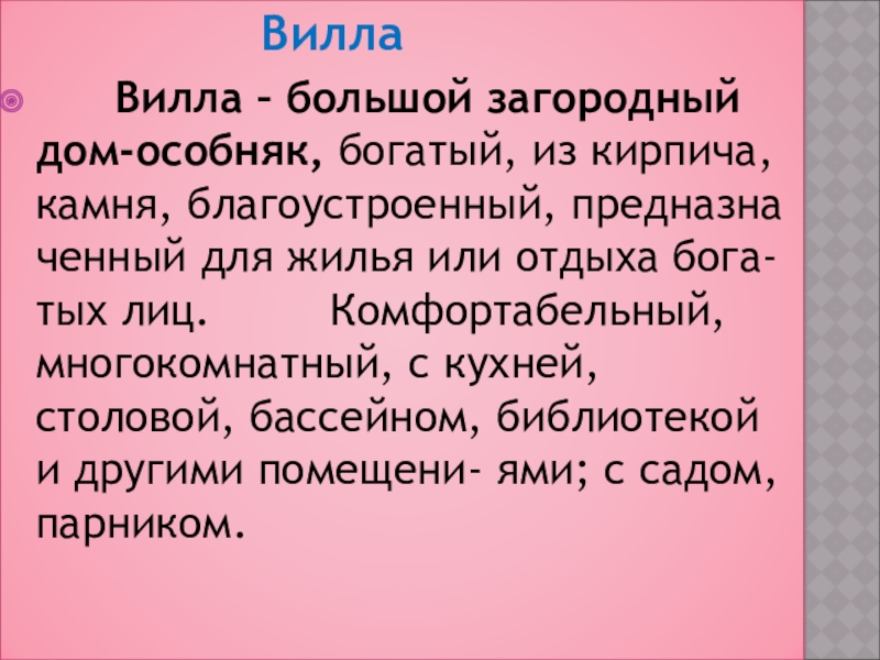 Вилла – большой загородный дом-особняк, богатый, из кирпича, камня, благоустроенный, предназна ченный для жилья или отдыха бога- тых лиц. Комфортабельный,многокомнатный, с кухней, столовой, бассейном, библиотекой и другими помещени- ями; с садом, парником.