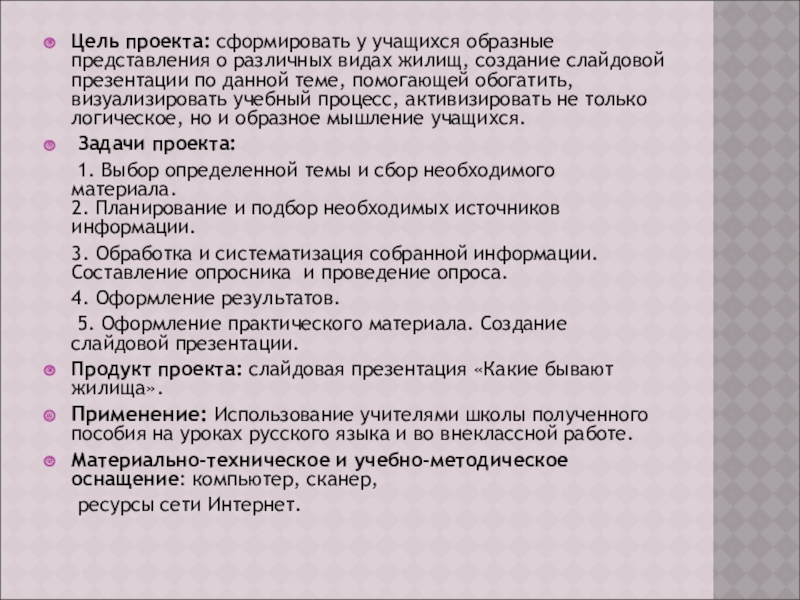 Слайд 2Цель проекта: сформировать у учащихся образные представления о различных видах жилищ,