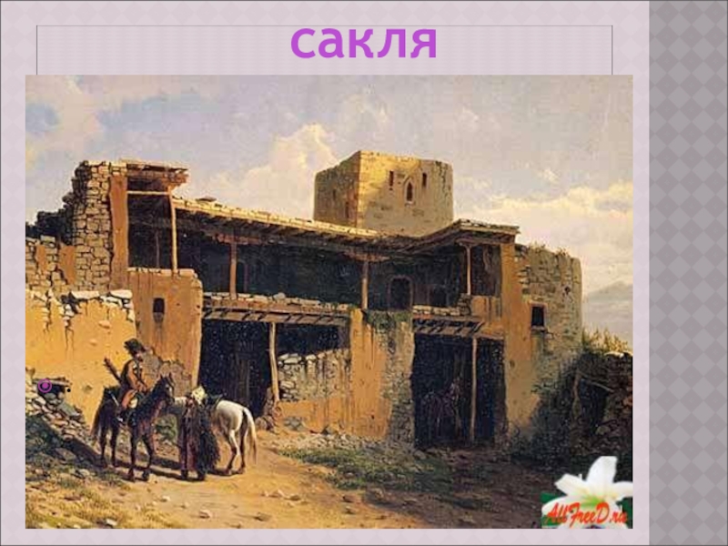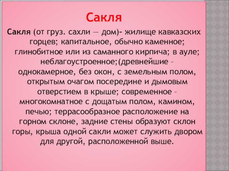 каменное; глинобитное или из саманного кирпича; в ауле; неблагоустроенное;(древнейшие – однокамерное, без окон, с земельным полом, открытым очагом посередине и дымовым отверстием в крыше; современное – многокомнатное с дощатым полом, камином, печью; террасообразное расположение на горном склоне, задние стены образуют склон горы, крыша одной сакли может служить двором для другой, расположенной выше.