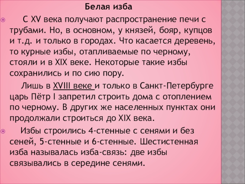 Лишь в XVIII веке и только в Санкт-Петербурге царь Пётр I запретил строить дома с отоплением по черному. В других же населенных пунктах они продолжали строиться до XIX века.