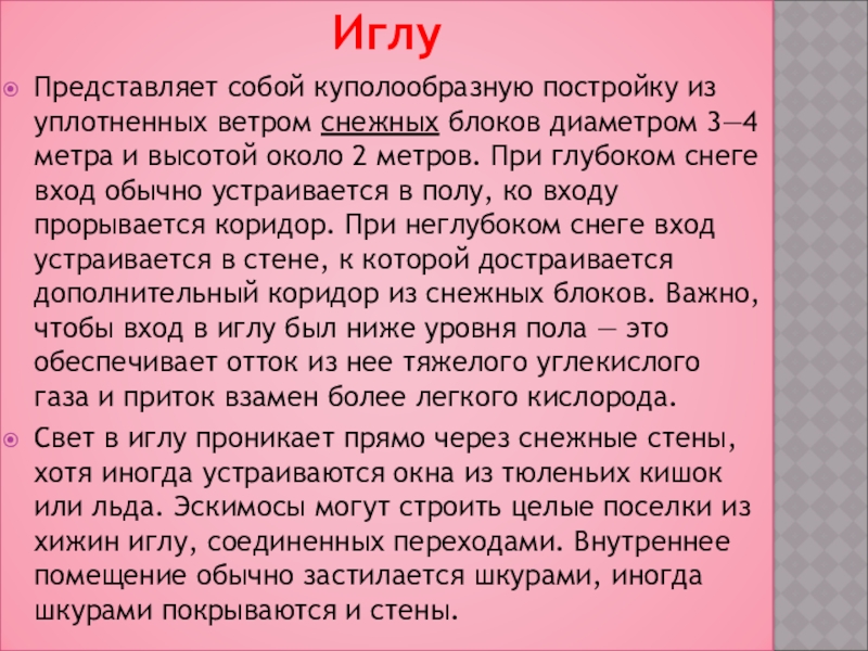 Свет в иглу проникает прямо через снежные стены, хотя иногда устраиваются окна из тюленьих кишок или льда. Эскимосы могут строить целые поселки из хижин иглу, соединенных переходами. Внутреннее помещение обычно застилается шкурами, иногда шкурами покрываются и стены.