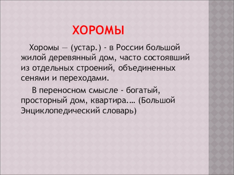 Хоромы — (устар.) - в России большой жилой деревянный дом, часто состоявший из отдельных строений, объединенных сенями и переходами.