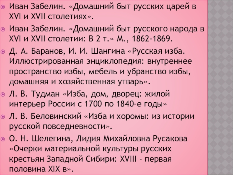 Д. А. Баранов, И. И. Шангина «Русская изба. Иллюстрированная энциклопедия: внутреннее пространство избы, мебель и убранство избы, домашняя и хозяйственная утварь».