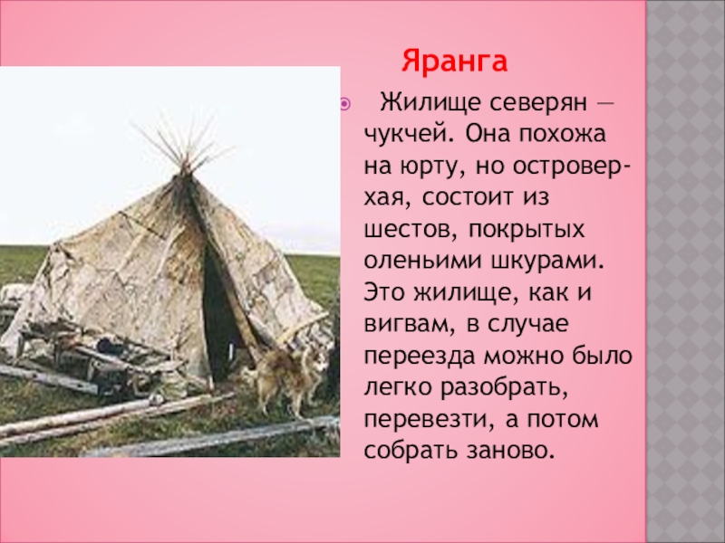 юрту, но островер- хая, состоит из шестов, покрытых оленьими шкурами. Это жилище, как и вигвам, в случае переезда можно было легко разобрать, перевезти, а потом собрать заново.
