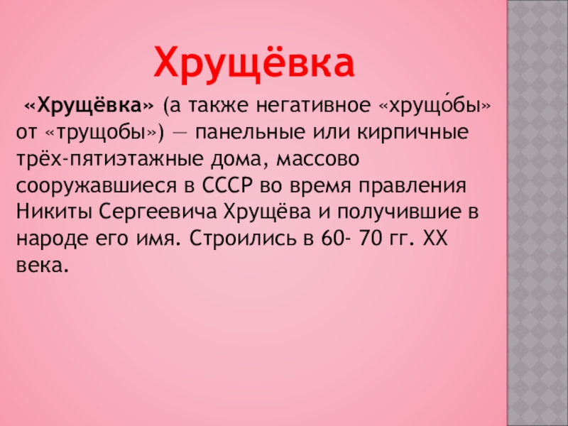 или кирпичные трёх-пятиэтажные дома, массово сооружавшиеся в СССР во время правления Никиты Сергеевича Хрущёва и получившие в народе его имя. Строились в 60- 70 гг. ХХ века.