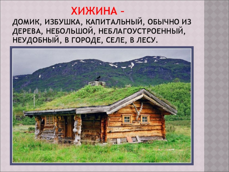 ДОМИК, ИЗБУШКА, КАПИТАЛЬНЫЙ, ОБЫЧНО ИЗ ДЕРЕВА, НЕБОЛЬШОЙ, НЕБЛАГОУСТРОЕННЫЙ, НЕУДОБНЫЙ, В ГОРОДЕ, СЕЛЕ, В ЛЕСУ.
