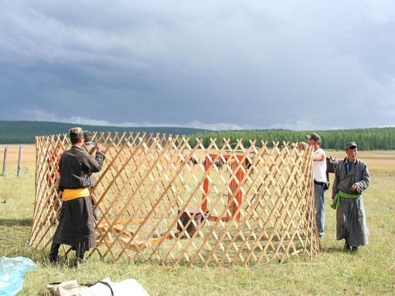 Из деревянных решетчатых стенок с куполом из жердей, крытое звериными шкурами; в центре – очаг, места у входа – для гостей; на женской половине – утварь, на мужской – сбруя.