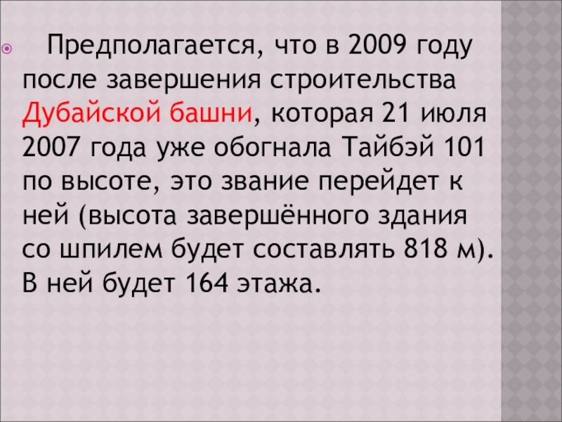башни, которая 21 июля 2007 года уже обогнала Тайбэй 101 по высоте, это звание перейдет к ней (высота завершённого здания со шпилем будет составлять 818 м). В ней будет 164 этажа.