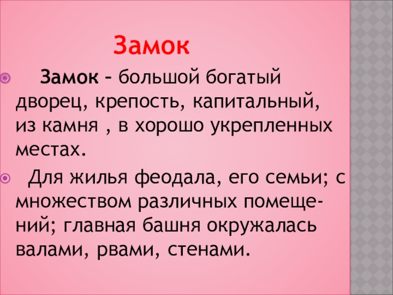 Замок – большой богатый дворец, крепость, капитальный, из камня , в хорошо укрепленных местах.