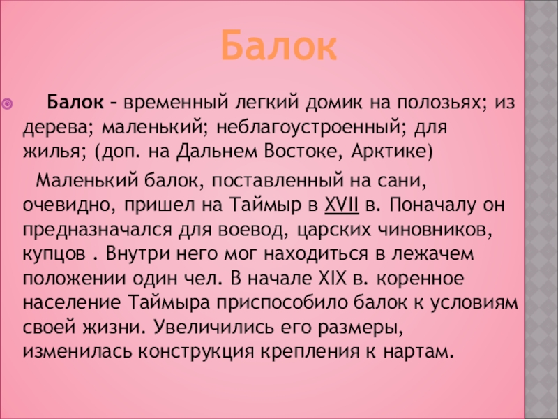 Балок – временный легкий домик на полозьях; из дерева;