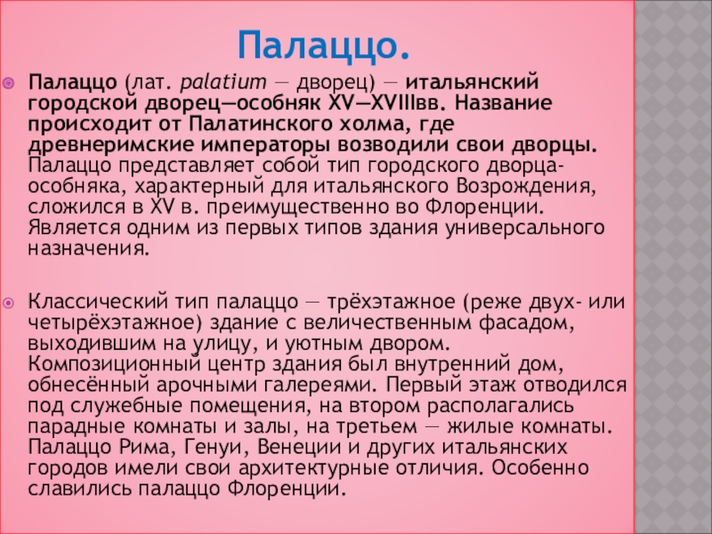 Палаццо (лат. palatium — дворец) — итальянский городской дворец—особняк XV—XVIIIвв. Название происходит от Палатинского холма, где древнеримские императоры возводили свои дворцы. Палаццо представляет собой тип городского дворца-особняка, характерный для итальянского Возрождения, сложился в XV в. преимущественно во Флоренции. Является одним из первых типов здания универсального назначения.