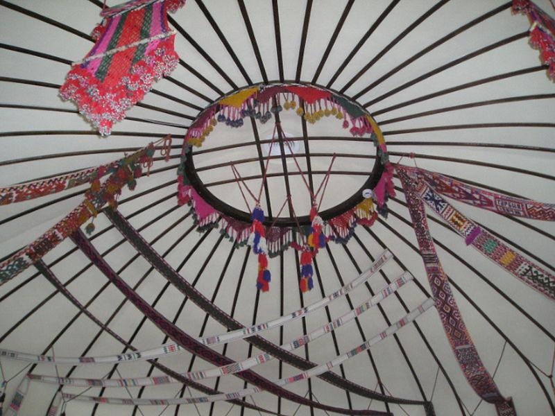 Ленты, различные по ширине и узору, тканые из шерстяной, чаще верблюжьей пряжи, служили украшением интерьера. С ободов внутрь юрты спускались тканые или плетеные узкие ленты, а в случае сильного ветра их привязывали к колу, вбитому в середине юрты. С купола свисали ленты для перевязывания жердей во время перевозок юрты. Эти ленты нередко заканчивались разноцветными кистями. Изнутри юрта делится на две половины: Север — женская, а Юг — мужская.