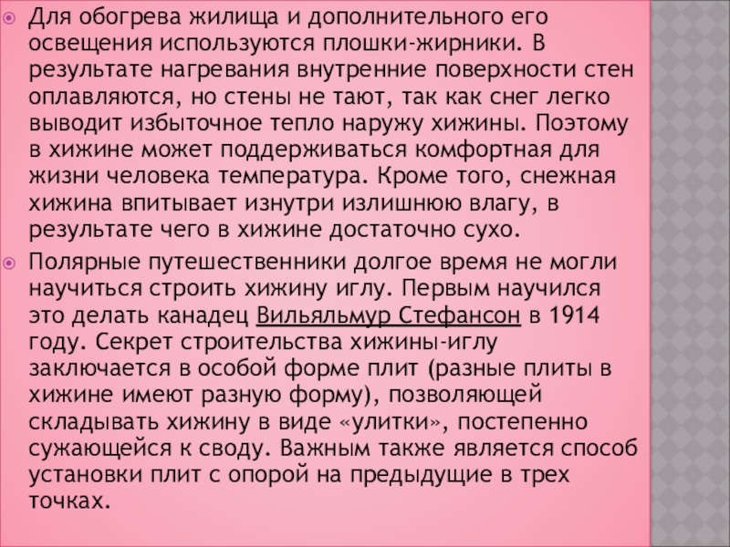 нагревания внутренние поверхности стен оплавляются, но стены не тают, так как снег легко выводит избыточное тепло наружу хижины. Поэтому в хижине может поддерживаться комфортная для жизни человека температура. Кроме того, снежная хижина впитывает изнутри излишнюю влагу, в результате чего в хижине достаточно сухо.
