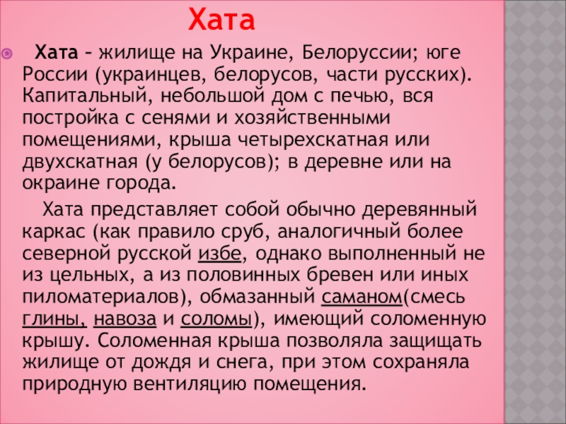 Хата – жилище на Украине, Белоруссии; юге России (украинцев, белорусов, части русских). Капитальный, небольшой дом с печью, вся постройка с сенями и хозяйственными помещениями, крыша четырехскатная или двухскатная (у белорусов); в деревне или на окраине города.