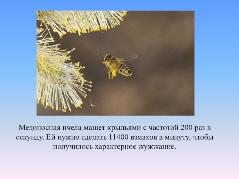 Слайд 48Медоносная пчела машет крыльями с частотой 200 раз в секунду. Ей
