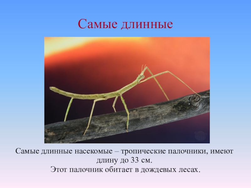 Самые длинные насекомые – тропические палочники, имеют длину до 33