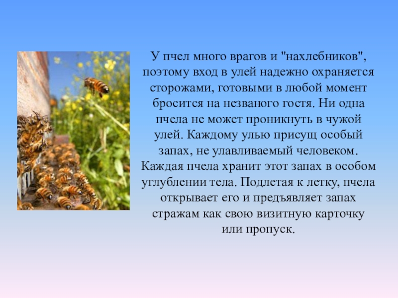 Слайд 50У пчел много врагов и "нахлебников", поэтому вход в улей надежно