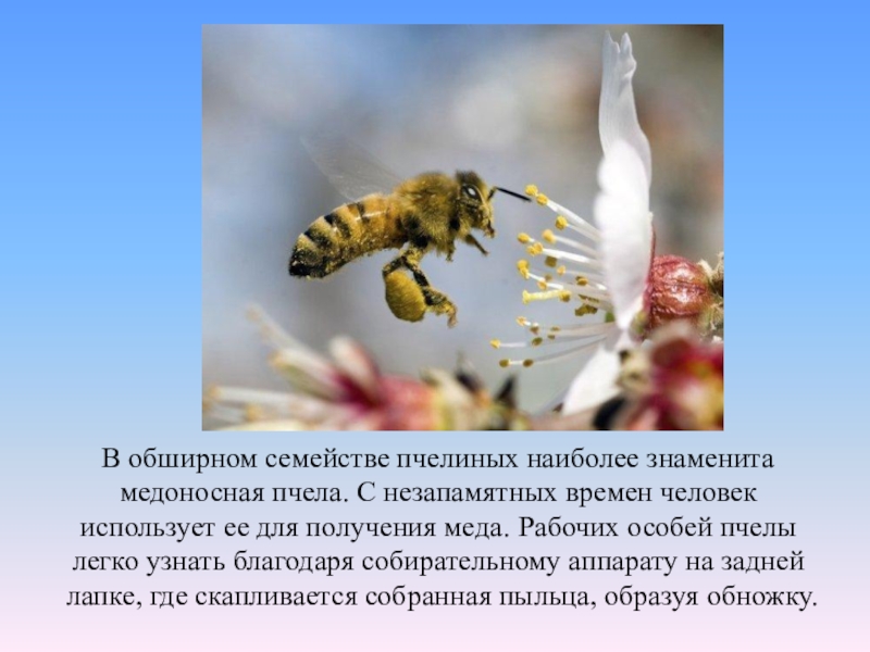 Слайд 46В обширном семействе пчелиных наиболее знаменита медоносная пчела. С незапамятных времен