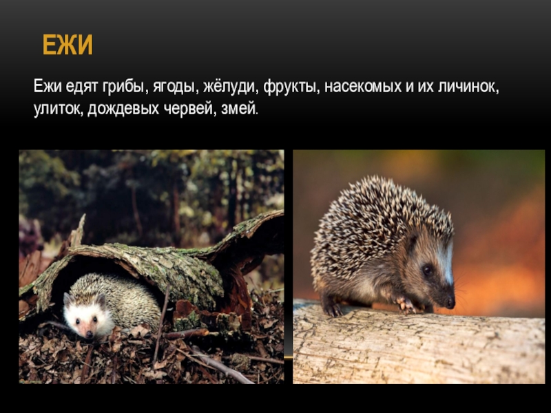 ежиЕжи едят грибы, ягоды, жёлуди, фрукты, насекомых и их личинок, улиток, дождевых червей, змей.